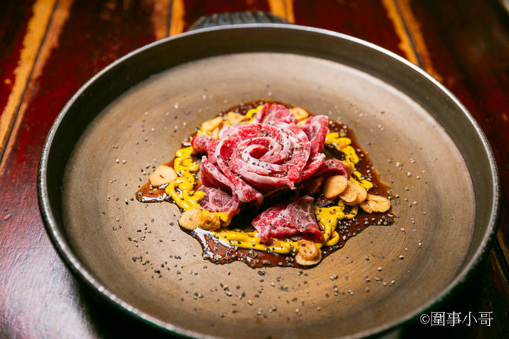 接著服務生端上來一個大銅盤,盤裡盛開著一朵玫瑰。啊~原來是用牛肉片特意擺盤成花朵的樣子,真用心!
