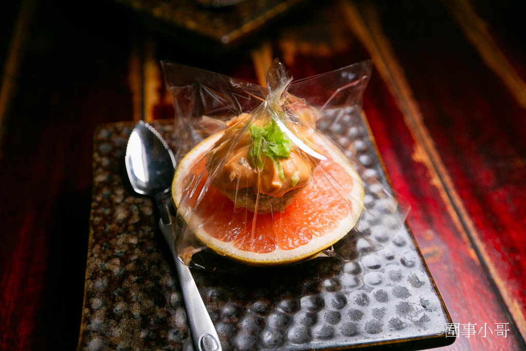 炸魚很清爽好吃~沾點醬汁當然更加的香甜,然後因為附上的是一把造型特殊前段帶點鋸齒的湯匙,應該就是讓客人可以挖底下的葡萄柚來吃的。