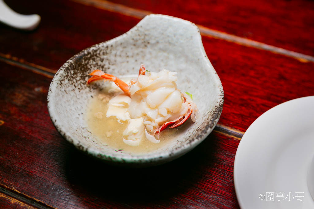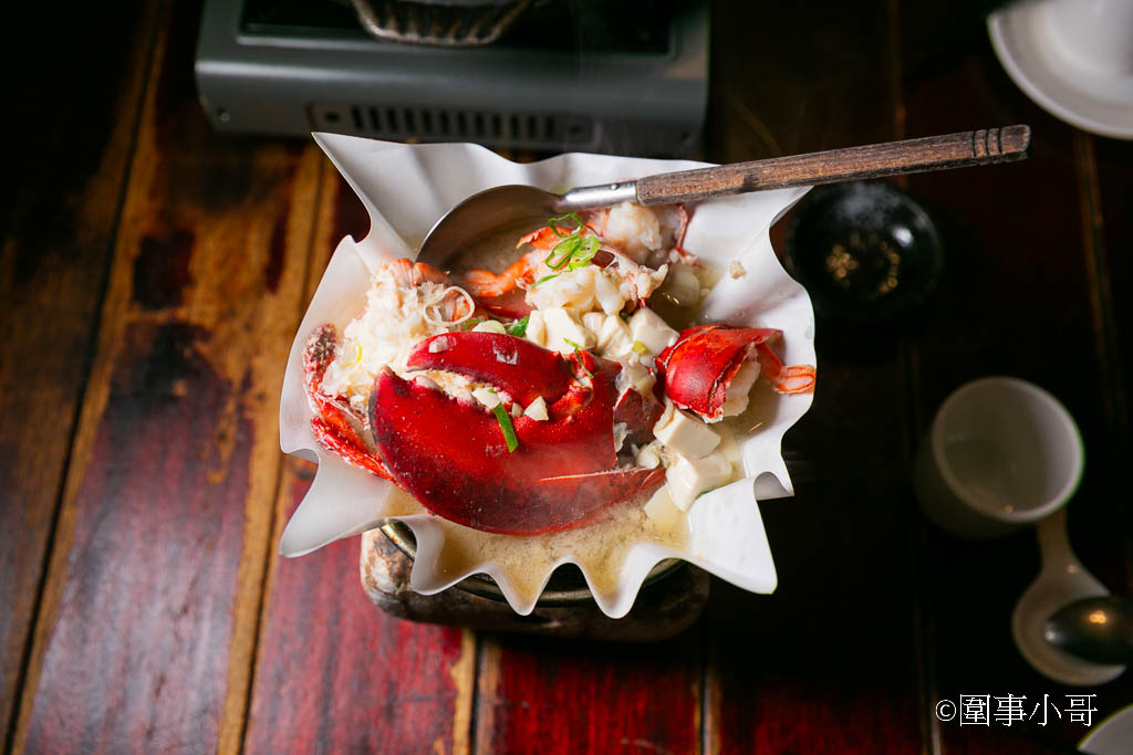 接著她送上一份正在冒著熱氣的火鍋,是紙火鍋呢。紙火鍋可以吸附雜質與油脂,煮出來的火鍋湯清味鮮。而且鍋裡的龍蝦肉質非常的肥美,在清徹的味噌湯頭裡燉煮著,也太誘人了啦。