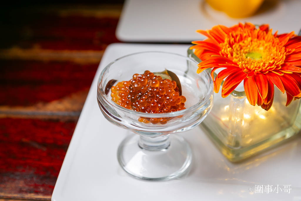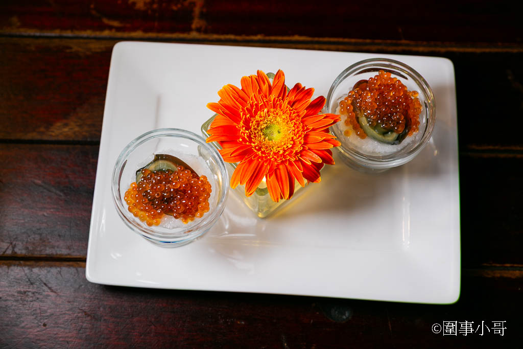 這道菜上桌的時候就讓我眼睛為之一亮,晶瑩剔透的飽滿鮭魚卵底下竟然放了皮蛋!最底下則是磨成泥的白蘿蔔~